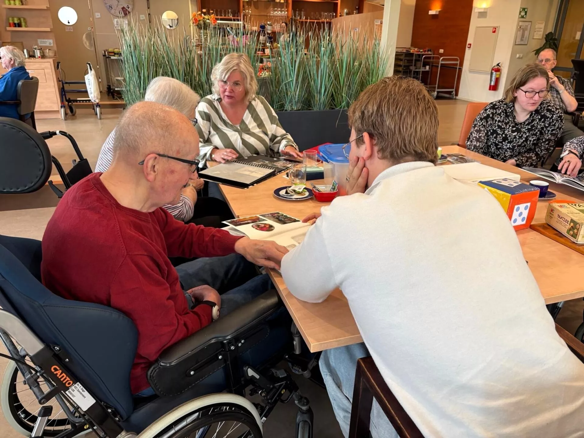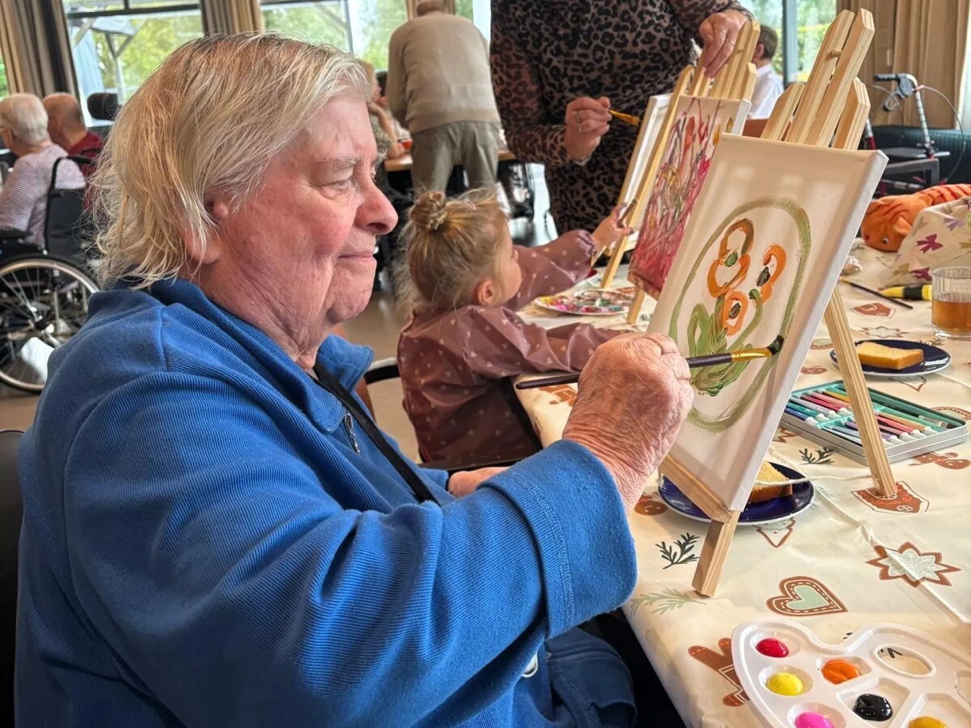 We gingen voor de derde keer naar De Hoven locatie Damsterheerd in Appingedam! Hier heeft men verschillende generaties samengebracht. Vanuit de gedachte van ‘samen zorgen’ waren kinderen en kleinkinderen uitgenodigd om een leuke activiteit te ondernemen met vader, moeder, opa of oma. Dit leverde mooie verhalen en activiteiten op. Zo hadden we zelfs een tafel waarbij vier generaties van één familie samen aan het schilderen waren, want er kwam ook een achterkleindochter mee.
