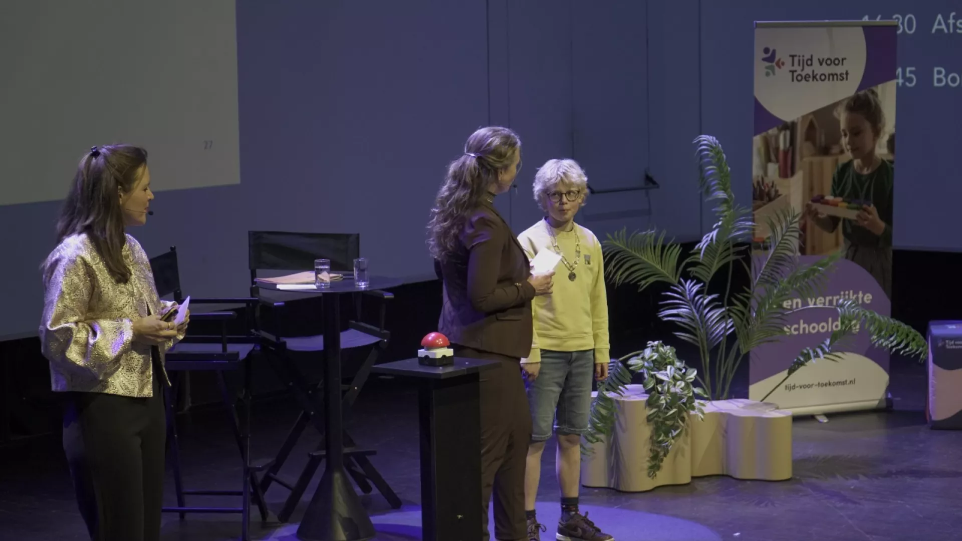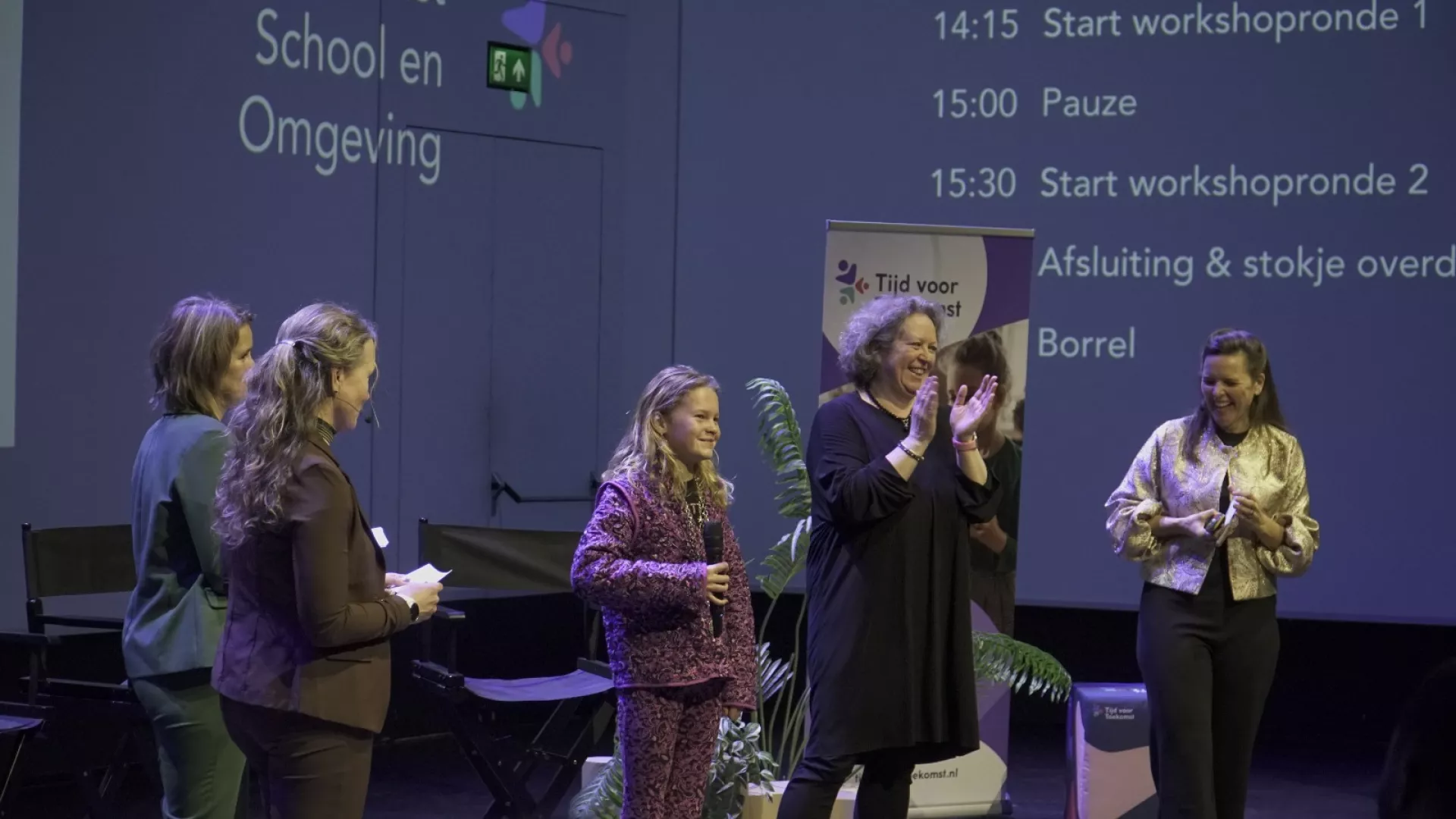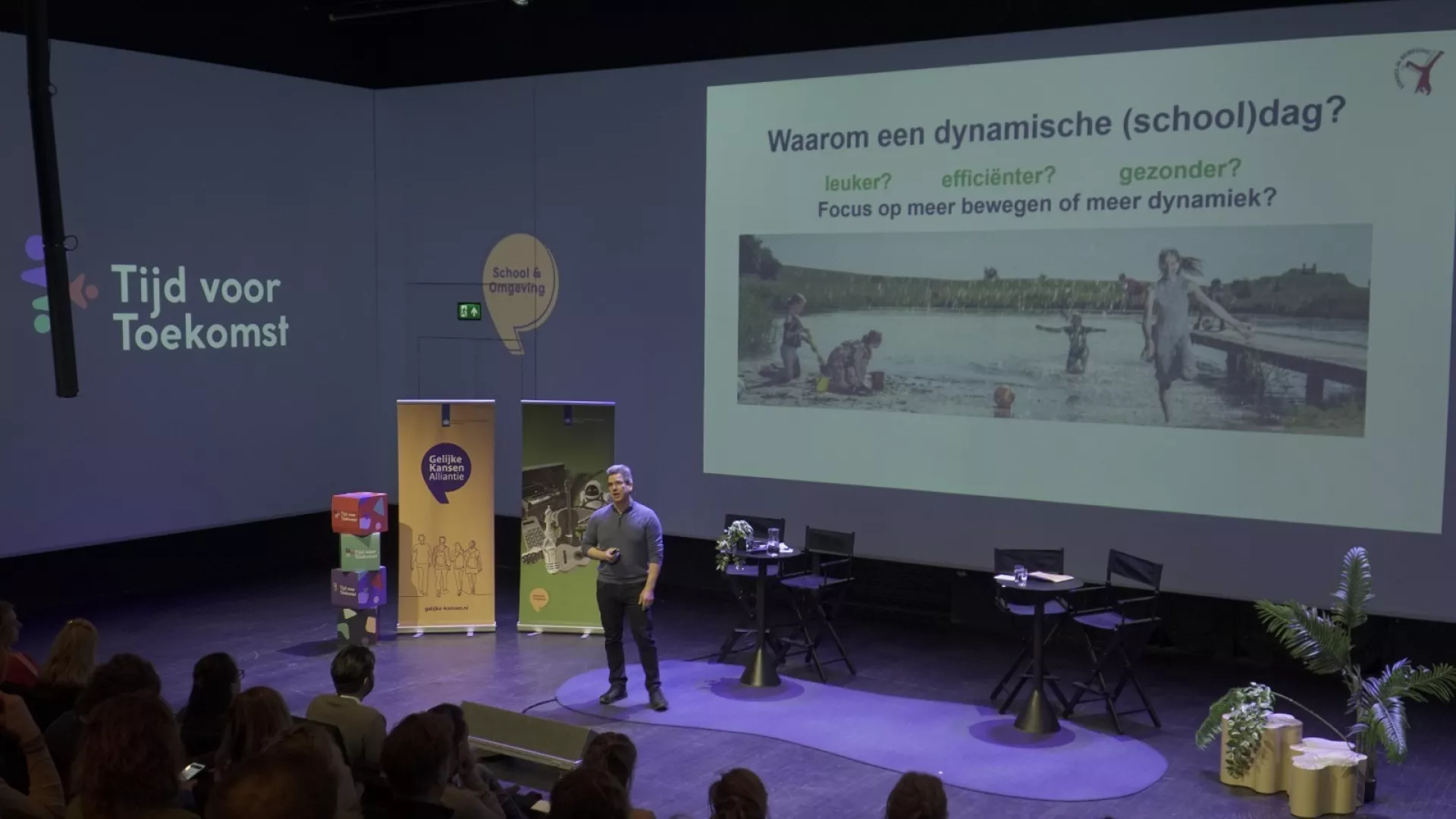 Een bijzonder moment vormde het betoog van kinderburgemeester Biene, die vanuit haar eigen ervaringen het belang van de verrijkte schooldag en gelijke kansen voor kinderen benadrukte. Met een energizer van Randall Martina (YETS Groningen) kwam het publiek vervolgens letterlijk in beweging. Jochen Mierau haakte hier direct op in met de opmerking dat dit een passend intermezzo was, omdat ‘zitten het nieuwe roken is’.