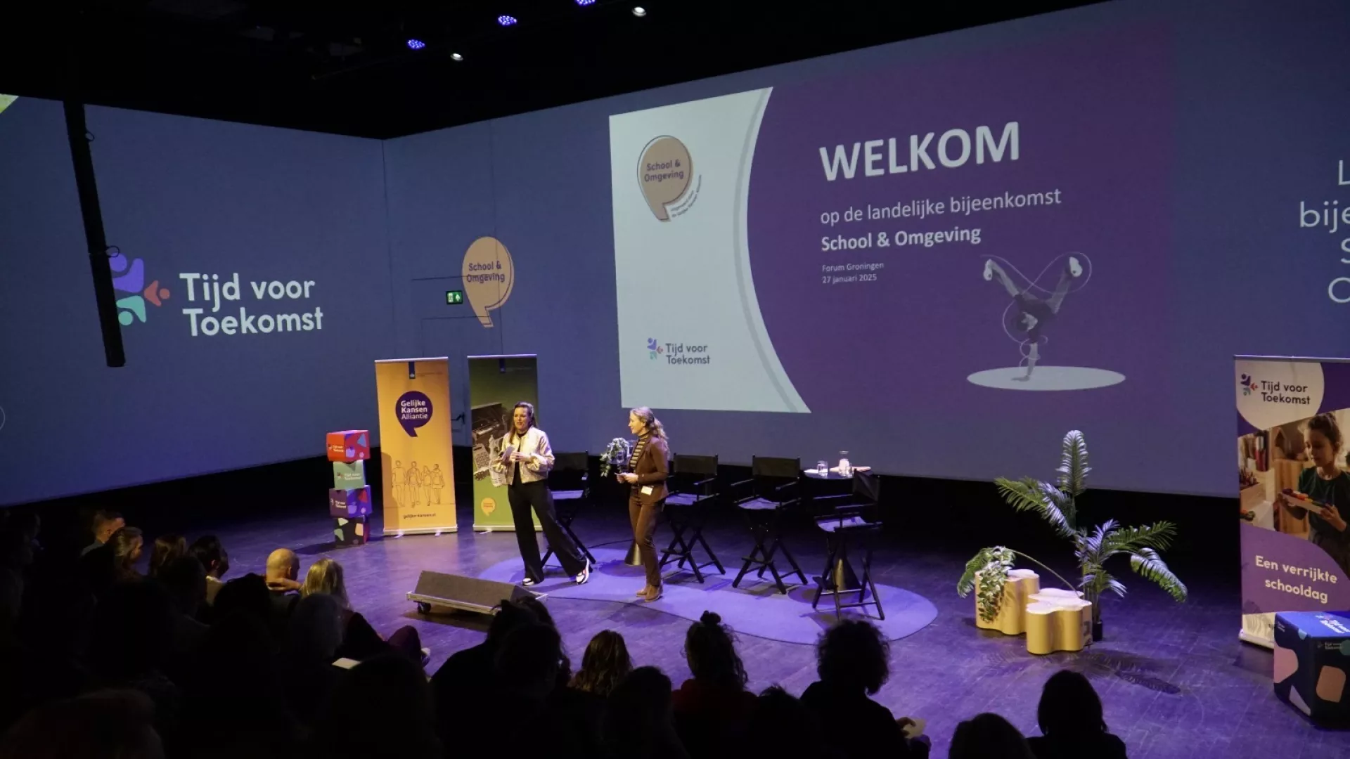 Op dinsdag 27 januari was de landelijke bijeenkomst van het programma School & Omgeving in Forum Groningen. Onderwijsprofessionals, gemeentemedewerkers en andere partners uit het hele land kwamen samen om kennis en ervaringen te delen over kansengelijkheid en de verrijkte schooldag. De bijeenkomst werd georganiseerd door de Gelijke Kansen Alliantie in samenwerking met lokale en regionale partners. Vanuit Tijd voor Toekomst werkten HANNN’ers Daniëlle en Janneke de afgelopen maanden hard mee aan de organisatie van deze dag.