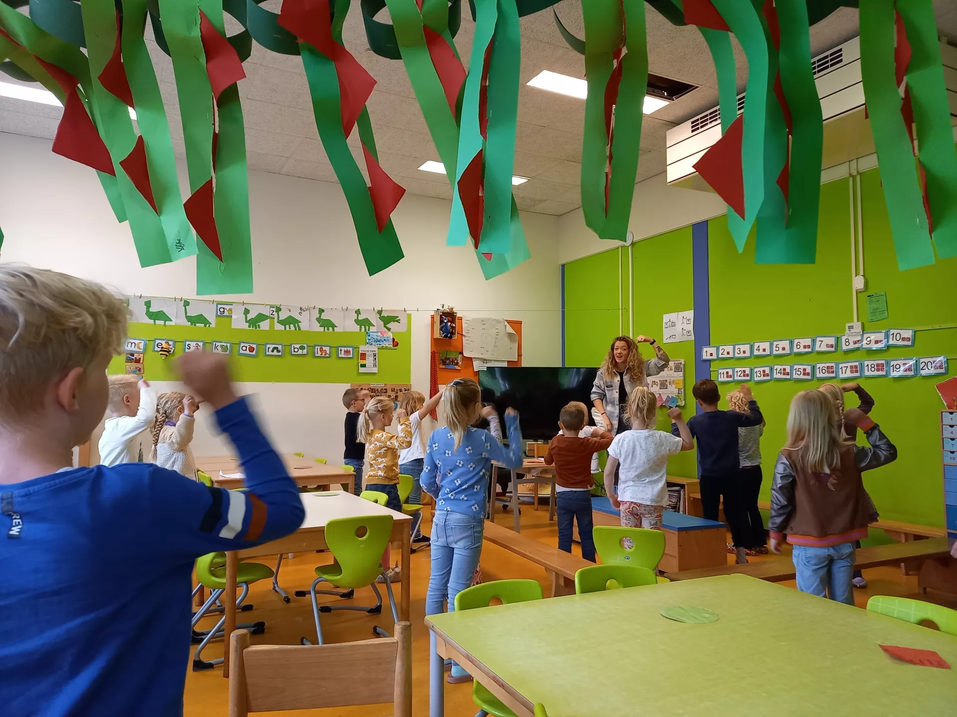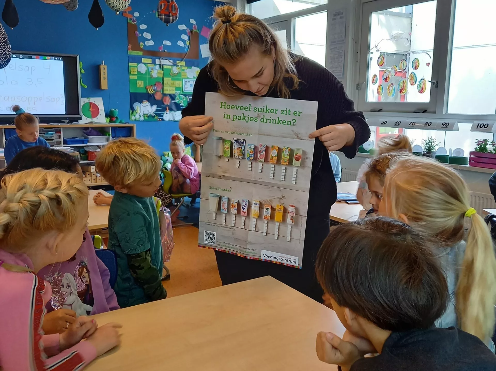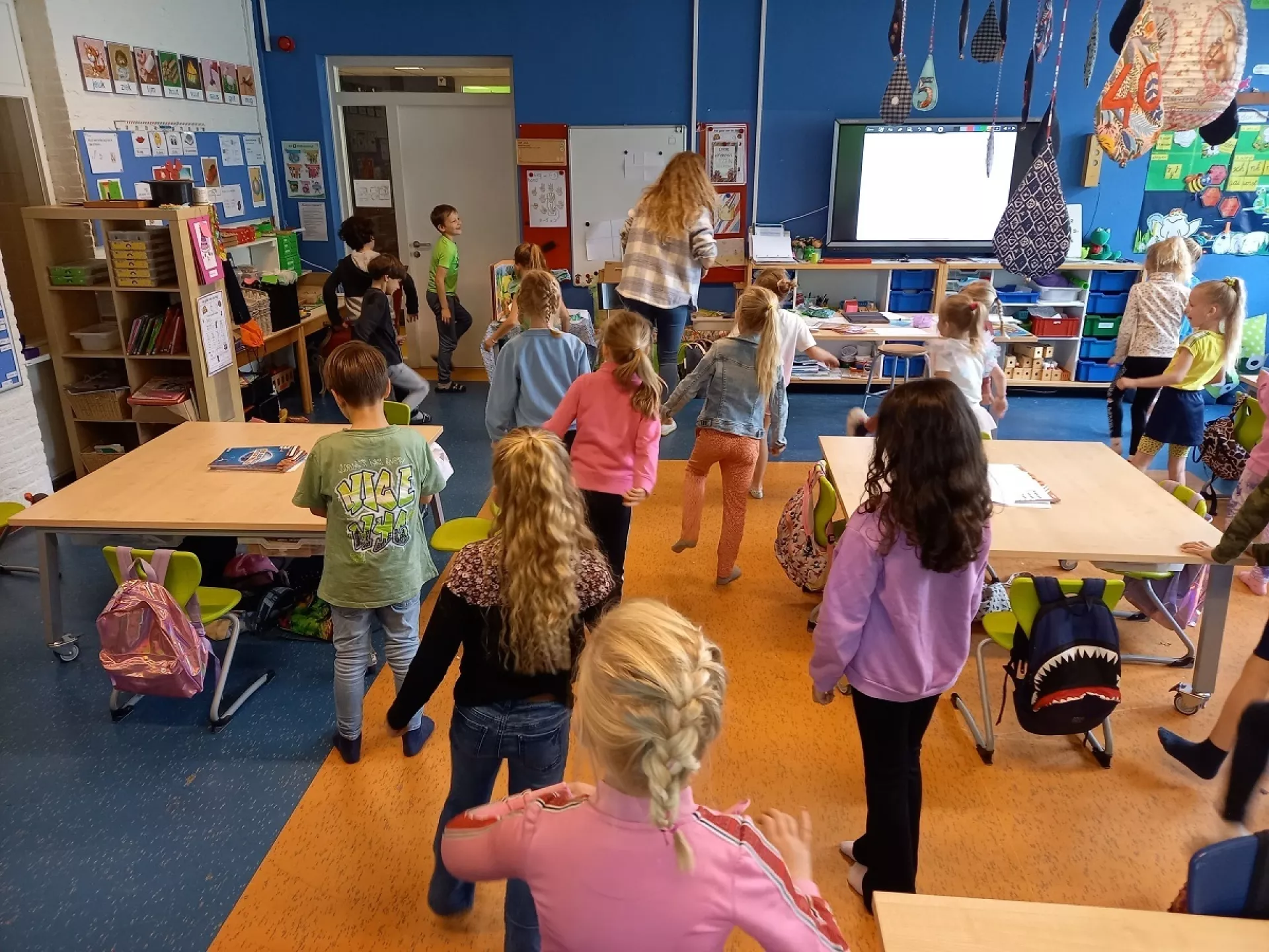 Vervolgens ging de les verder over bewegen: met als eerste een energizer waarbij iedereen zelf lekker in beweging kwam. En daarbij natuurlijk de vraag 'waarom is bewegen belangrijk?' En wat doen ze zelf aan beweging/sport?