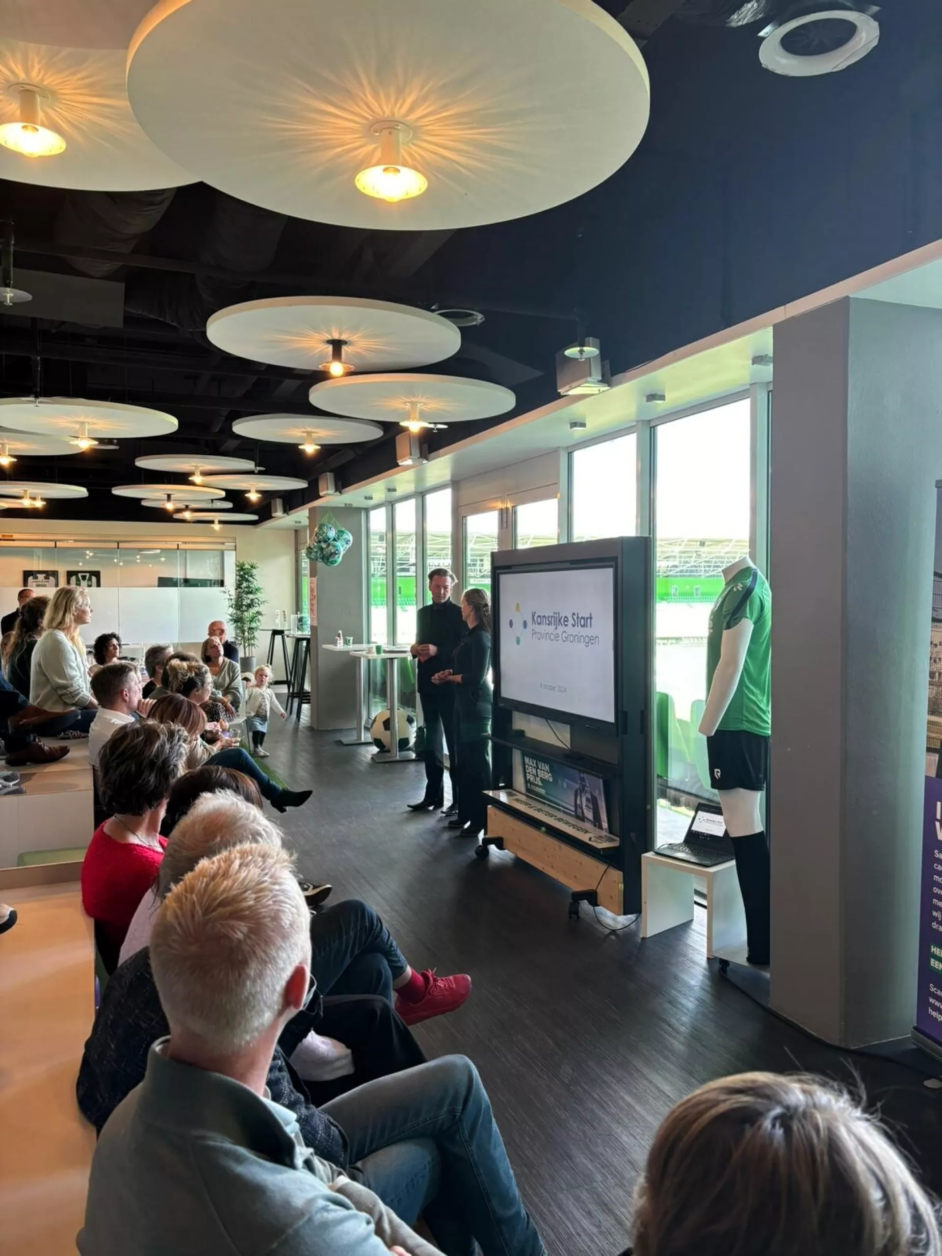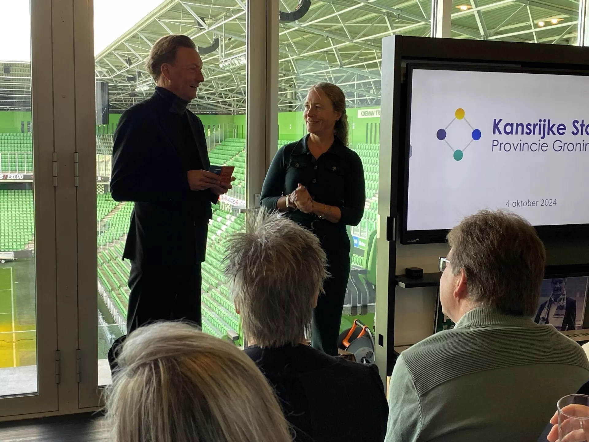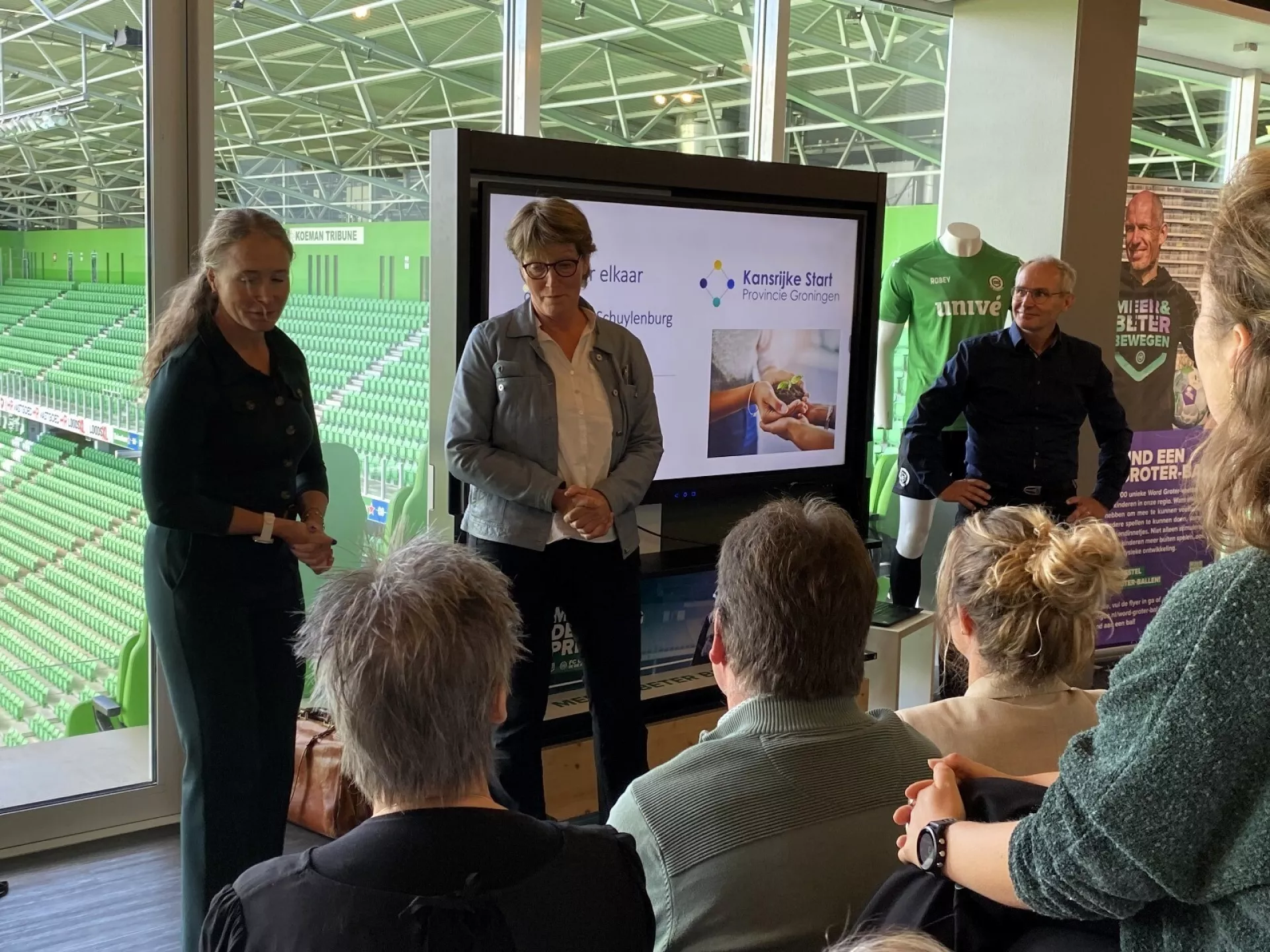 Op vrijdag 4 oktober werd de achtste editie van de Week voor Meer Gezonde Jaren feestelijk geopend in de skybox van FC Groningen in de Maatschappij. Onder een stralende middagzon verwelkomde Daniëlle Bekkering (directeur HANNN) de aanwezigen. Met een inspirerende warming-up, samen met gedeputeerde Tjeerd van Dekken, leidde ze het thema ‘Oog voor elkaar’ in. Daarna stelde Daniëlle enkele vragen aan Simon Cageling van FC Groningen in de Maatschappij en hij vertelde over de maatschappelijke impact van de club in de regio.